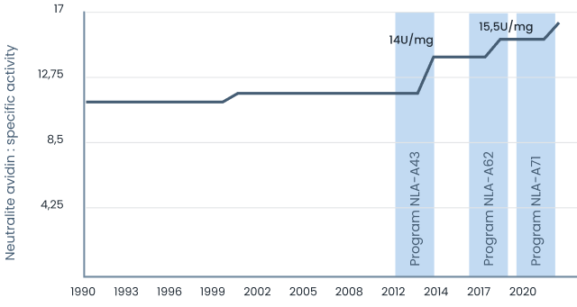 Upon reaching maximum purity for native avidin, the focus shifted to its first derivative: Neutralite Avidin. Initially, in 1990, Neutralite Avidin had a specific activity of over 11 U/mg. The production process at that time was complex, and the specific activity was somewhat compromised by the chemical ingredients used.
